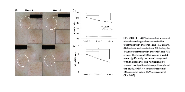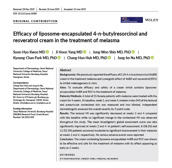 Cơ chế ức chế melanin từ 4-n-Butylresorcinol và Resveratrol kết hợp công nghệ liposome giúp cải thiện nám rõ rệt chỉ sau 2 tuần – theo nghiên cứu lâm sàng từ Đại học Seoul. Tổng hợp từ Nghiên cứu được đăng trên Tạp chí khoa học J Cosmet Dermatol. 2019;00:1–5.