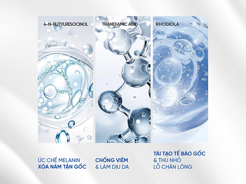 Công thức của sản phẩm là sự kết hợp giữa các hoạt chất điều trị nám thế hệ mới và hệ dưỡng chất phục hồi tiên tiến: